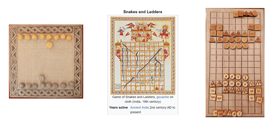 Ludus Latrunculorum, a Roman variant of a Greek game mentioned by Plato, operates similar to the Scandinavian Tafl games with Rook-like moves and captures by sandwiching of opponent pieces. The Indian Snakes and Ladders dates to antiquity, and as per its original title moksha patel, it reinforces the Hindu concept of moksha in which good deeds (ladders) cause one to advance in life whereas bad deeds (chutes) cause one to retreat. Rithmomachia dates from medieval times, with the completion of numerical sequences or mathematical operations by sets of pieces allowing capture of numerical opponent pieces. This “Philosopher’s Game” encouraged the contemplation of Boethian (Roman senator and philosopher, 477 – 524 A.D.) mathematical harmonies in the universe (ratios involved in musical harmonies are included) between the 12th and 16th centuries in Medieval Europe.