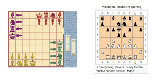 Chinese chess, or xiangqi, has the same 2-square-diagonal-hopping Elephant (forerunner of the modern Bishop, which first appeared in Courier Chess above), and pawns move and attack straight forward only (in contrast to the Western Pawn which captures diagonally), and promote to obtain a sideways move upon crossing the central “river.”