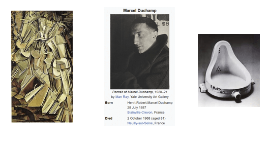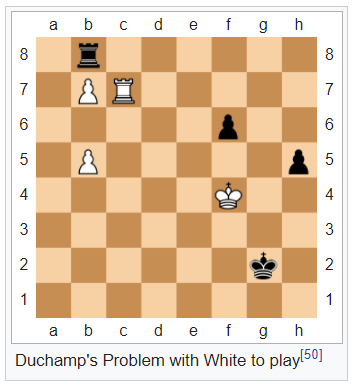 Marcel Duchamp, French-American painter, sculptor and chess player, like the Impressionists seeking to incorporate the notion of time in his artwork, as seen in his Nude Descending a Staircase, No. 2, said to combine the abstraction of Cubists with the idea of movement of Futurists. His foray into realism in art perhaps highlighted his fame, with his 1917 Fountain. Otherwise, he declared chess to be a disappointing mistress, “I am still a victim of chess, it has all the beauty of art.” He realized he could never achieve top honors in competition, but did engage in correspondence chess and problem composing; his 1911 Portrait of Chess Players, inspired by watching his brothers play chess, is on display at the Philadelphia Museum of Art. The following problem was in included in an art exhibit, though most people conclude that White does not have a win at his disposal. Duchamp’s friendship with and influence on Irish playwright Samuel Beckett is seen in Beckett’s 1957 play, Endgame.