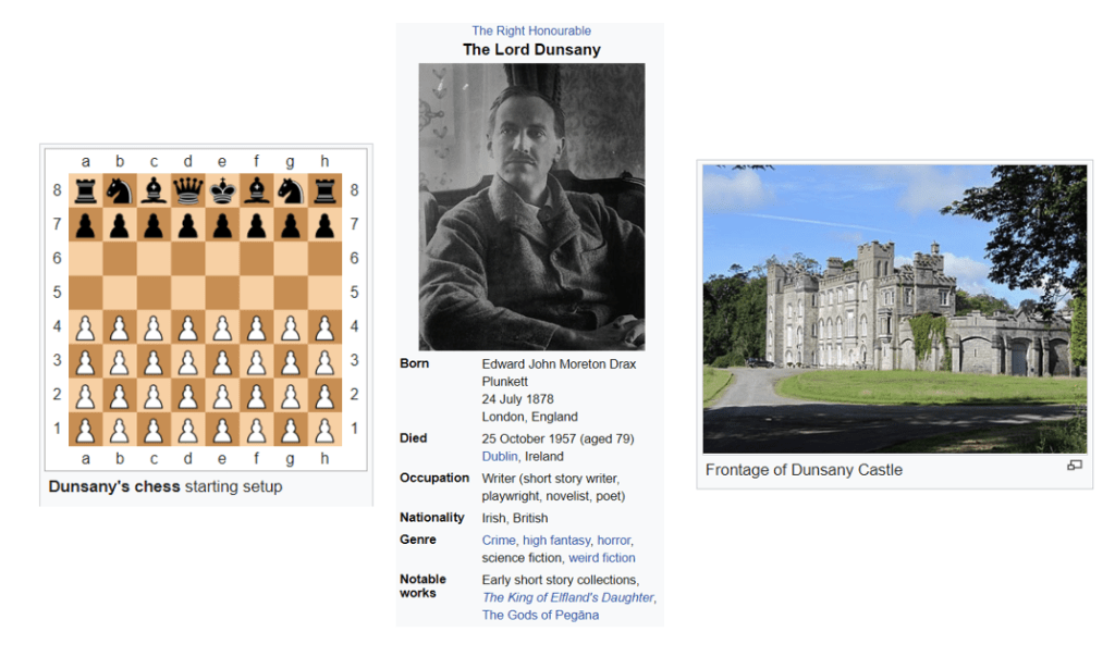 Dunsany’s Chess, invented by Edwin [John Moreton Drax] Plunkett, [Lord] 18th Baron of Dunsany, holder of the 2nd oldest peerage in Ireland (dating to 1439), and chess- and pistol- shooting champion of Ireland, in addition to authoring hundreds of short stories, invented this unbalanced form of chess in 1942. Also a symbol democratic resistance in Middle Eastern countries, it is in fat difficult to win the the massive pawn horde, so advancing two central pawns a square or adding four more in front had been attempted to balance this very unbalanced variant.