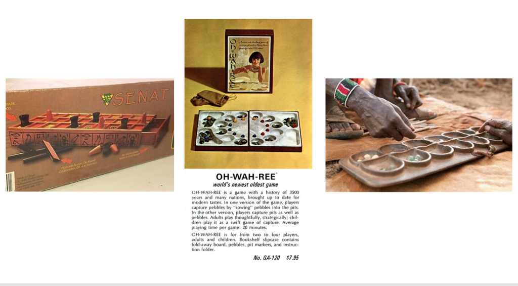 “Race games” similar to modern games like Parcheesi and Backgammon, originated in Egypt and across Africa with Senat, Oh-wah-ree and Mancala.